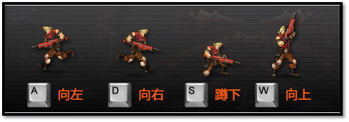移动:W向上瞄准,S下蹲,A向左走,D向右走(或方向键上下左右);