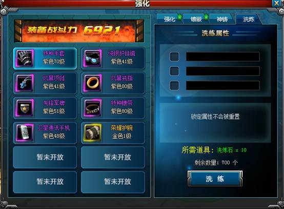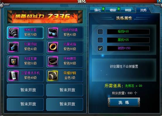 每个装备都是可洗炼,洗炼可以给人物带来永久的属性加成,洗炼的品质依次是绿色、蓝色、紫色、金色随机出现的。每个装备都有3个槽位可洗炼,可以随机洗出自己想要的属性,洗炼需要消耗一定洗炼石,初始默认是10个洗炼石。