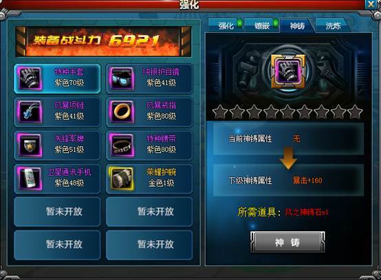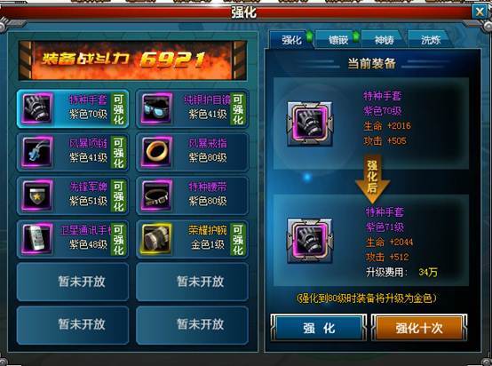 任意一件装备可强化至的最高等级与当前人物等级相同;任何装备强化都是百分百成功且无强化冷却时间,避免了玩家因装备强化失败而造成的挫败感。