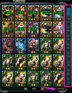 卡牌仓库:仓库里最上面显示的是已经装备的卡片,并且仓库里卡牌显示都是品质、等级越高的显示在前面,玩家可以点击全部查看所有的卡牌,也可以选择分类查看卡牌情况,仓库最下面会显示所拥有的卡牌数量。
