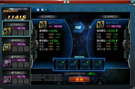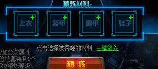 精炼每个套装都需要吞噬4个部位的套装各1个,当背包内有足够的套装之时,玩家点击一键放入,即可进行精炼以提高套装等级,玩家每次精炼之前都可以看到下一阶套装所增加的属性。